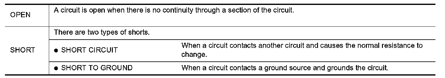 The continuity check is used to find an open in the circuit. The digital multimeter (DMM) set on the resistance function will indicate an open circuit as over limit (no beep tone or no ohms symbol). Make sure to always start with the DMM at the highest resistance level.
