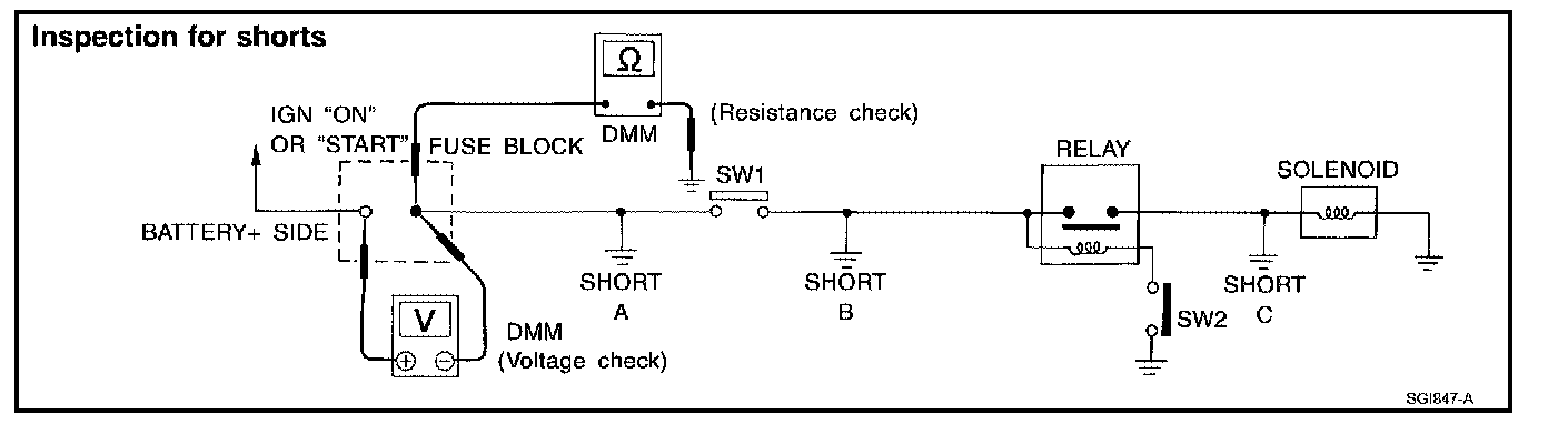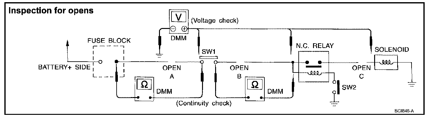 - Connect the other probe to the fuse block (power) side of SW1. Little or no resistance will indicate that portion of the circuit has good continuity. If there were an open in the circuit, the DMM would indicate an over limit or infinite resistance condition. (point A)
