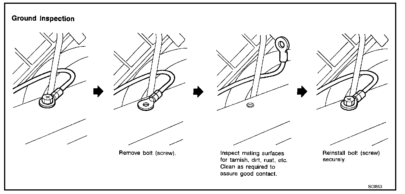 To inspect components under the hood, start by verifying the integrity of ground connections. (Refer to Ground Inspection described later.) First check that the system is properly grounded. Then check for loose connection by gently shaking the wiring or components as previously explained. Using the wiring diagrams inspect the wiring for continuity.