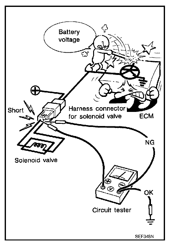 voltage; short is down the circuit of the relay or between the relay and the disconnected solenoid (point C).
