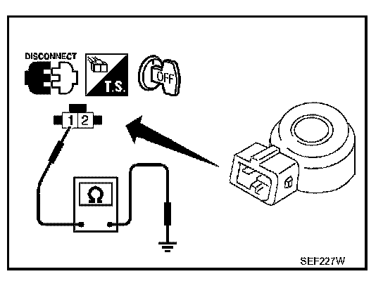 Check resistance between knock sensor terminal 1 and ground.
