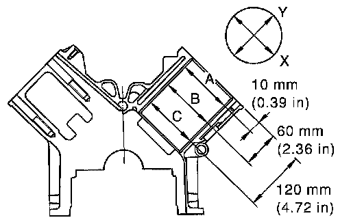 ^ Measure the cylinder bore for wear, out-of-round and taper at six different points on each cylinder. ("X" and "Y" directions at "A","B" and "C")