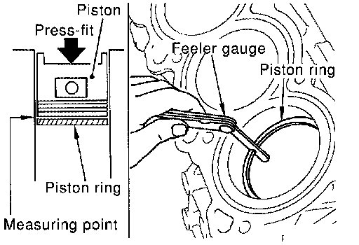 ^ Insert the piston ring into the middle of the cylinder using the piston, and measure gap.
