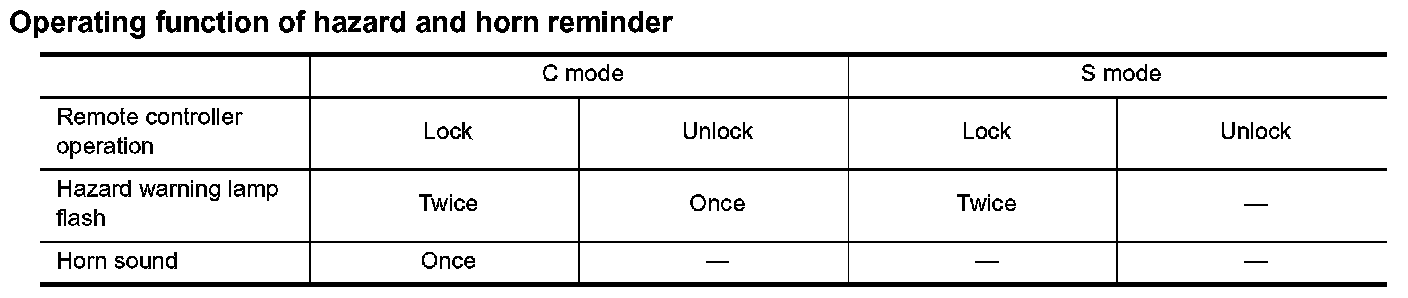 When LOCK and UNLOCK signals are sent from the key fob for more than 2 seconds at the same time, the hazard and horn reminder mode is changed and hazard warning lamp flashes and horn sounds as follows:
