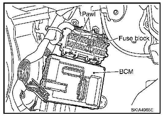 4. Raise the pawl of fuse block and remove bracket from fuse block to remove BCM.