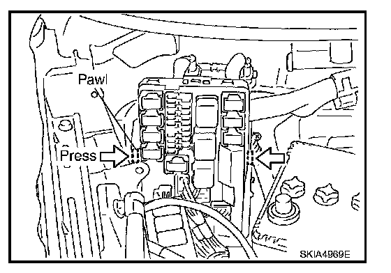 3. While pressing pawls on right and left side of IPDM E/R, remove IPDM E/R cover B from IPDM E/R.