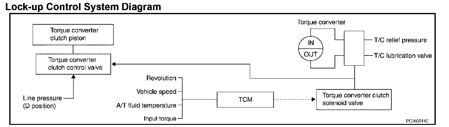Lock-up ControlThe torque converter clutch piston in the torque converter is engaged to eliminate torque converter slip to increase power transmission efficiency. The torque converter clutch control valve operation is controlled by the torque converter clutch solenoid valve, which is controlled by a signal from TCM, and the torque converter clutch control valve engages or releases the torque converter clutch piston.