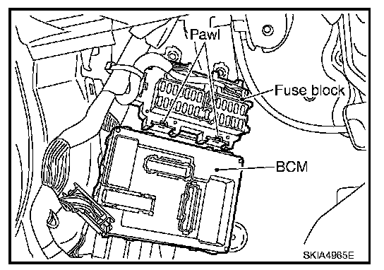 4. Raise the pawl of fuse block and remove bracket from fuse block to remove BCM.