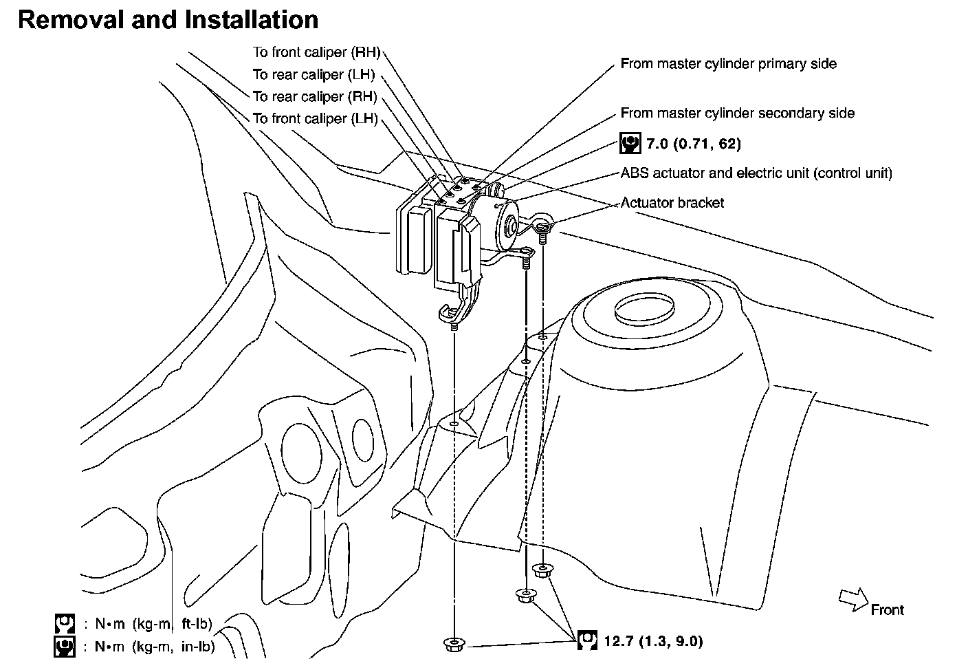 ^ Do not remove and install ABS actuator and electric unit (control unit) by holding harness.