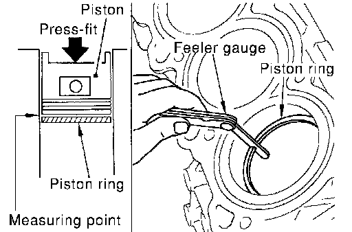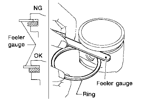 ^ Lubricate with new engine oil to piston and piston ring, and then insert piston ring until middle of cylinder with piston, and measure the piston ring end gap with a feeler gauge.