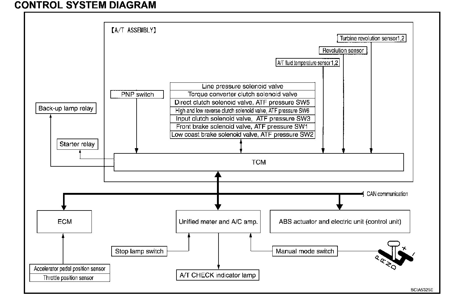 The automatic transmission senses vehicle operating conditions through various sensors or signals. It always controls the optimum shift position and reduces shifting and lock-up shocks.