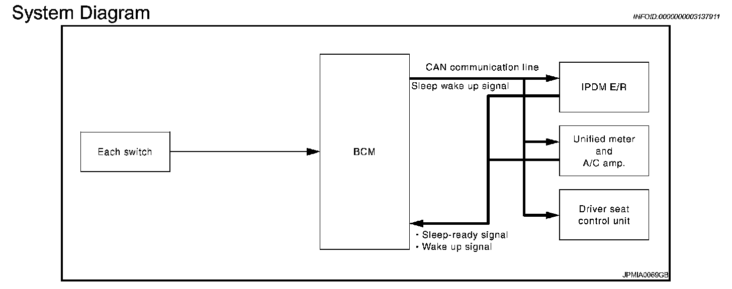 - BCM receives the sleep-ready signal (ready) from IPDM E/R and unified meter and A/C amp. via CAN communication.