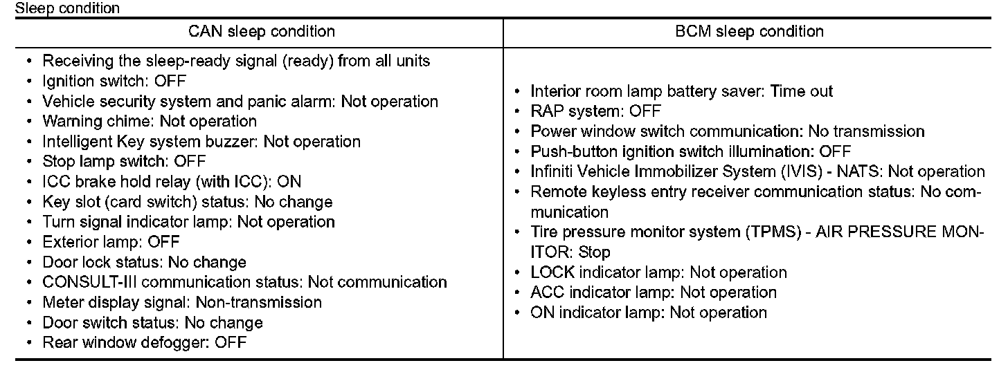 - BCM transmits the sleep wake up signal (sleep) to each unit when all of the CAN sleep conditions are fulfilled.