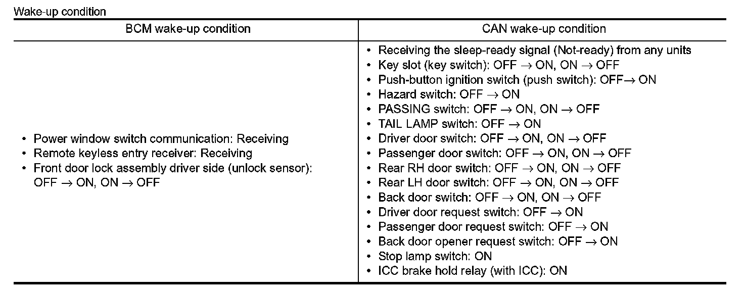 - BCM transmits the sleep wake up signal (wake up) to each unit when any of the CAN wake-up conditions is fulfilled. It changes from the low power consumption mode or the CAN communication sleep mode to the normal mode.