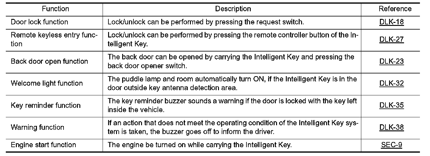 - The Intelligent Key system is a system that makes it possible to lock and unlock the door locks (door lock/ unlock function) by carrying the Intelligent Key, which operates based on the results of electronic ID verification using two-way communications between the Intelligent Key and the vehicle (BCM).