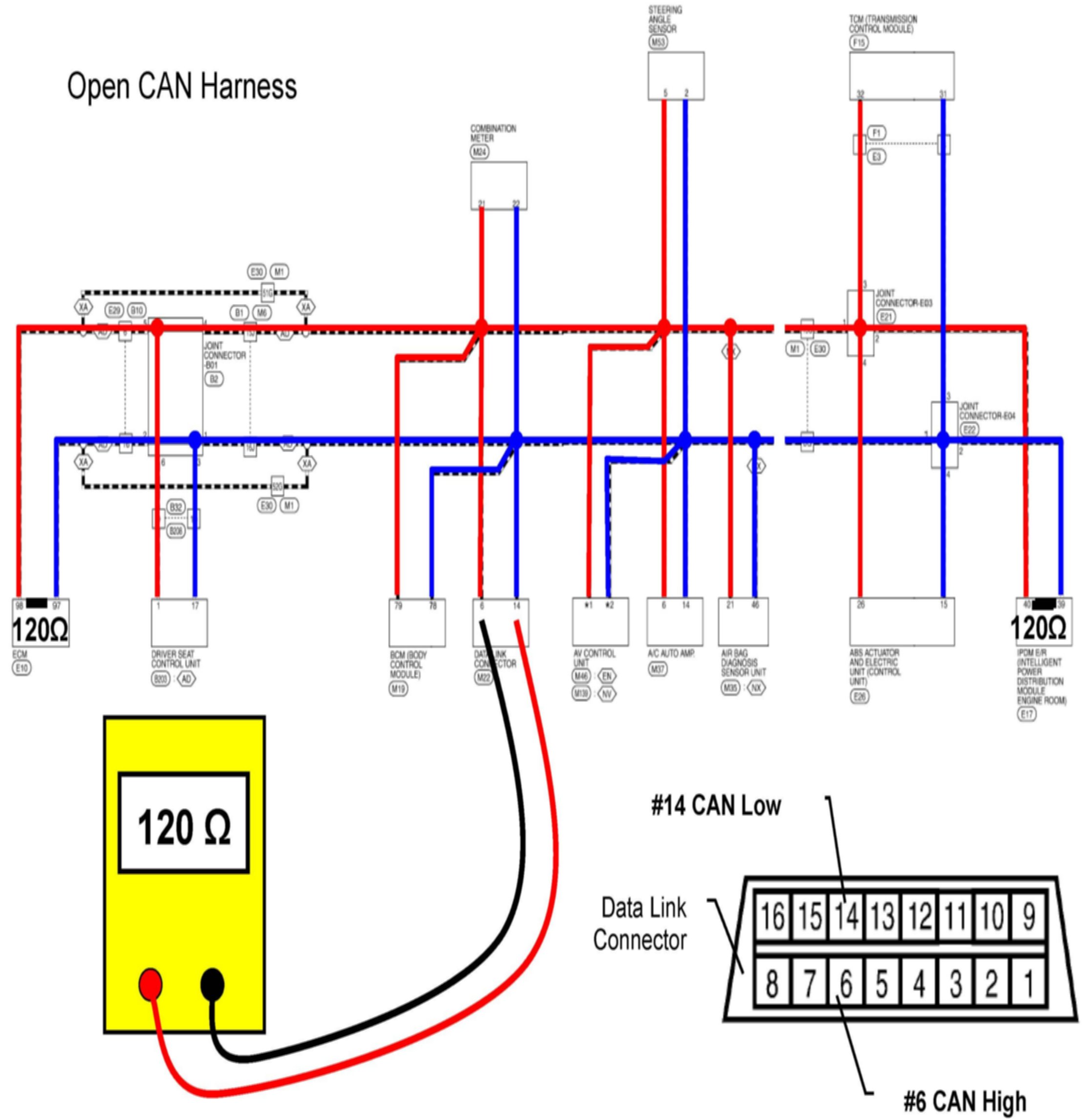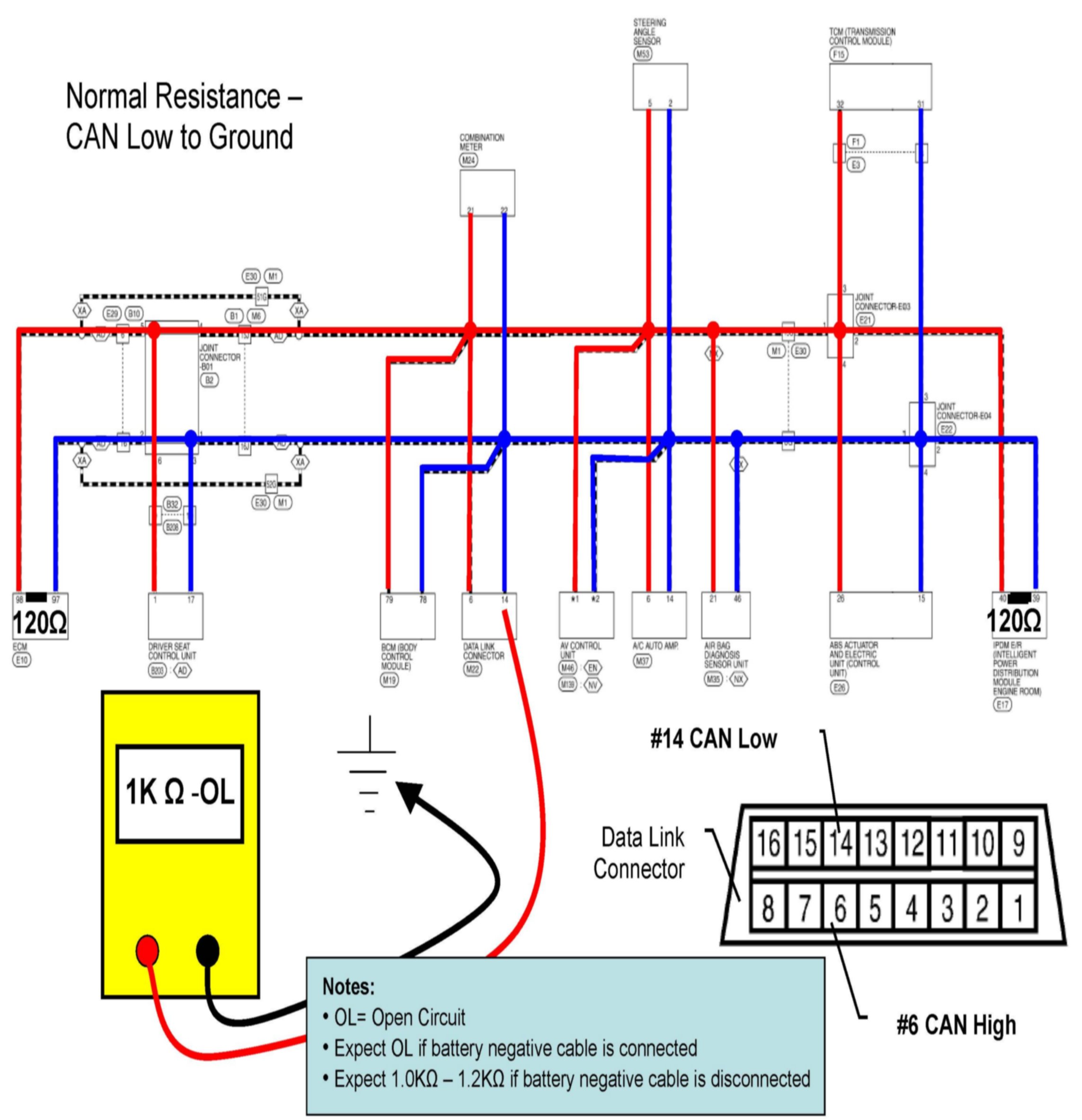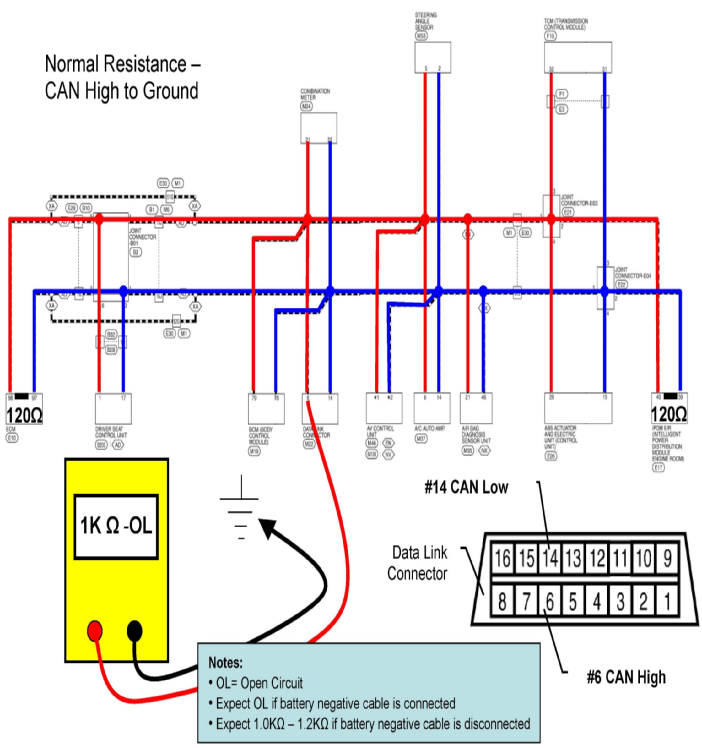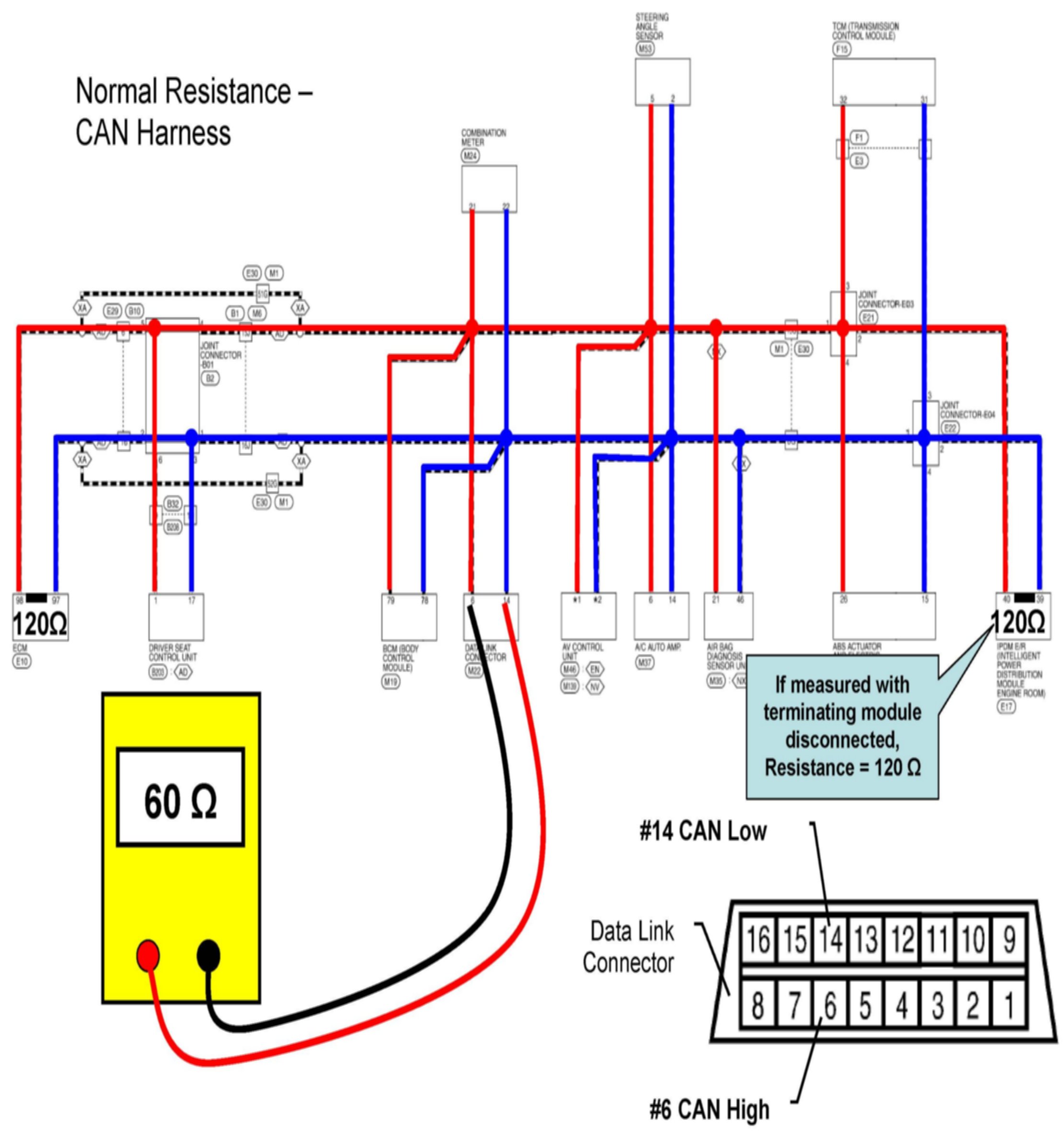 ^ Always confirm the power, ground, and CAN resistance at a suspect module before replacing the module. Resistance should be close to 60 ohms at the module (measured with the battery disconnected). The resistance at terminating modules should be close to 120 ohms. Examples of terminating modules include IPDM, ECM, or BCM. Reference the appropriate ESM to determine the terminating modules.