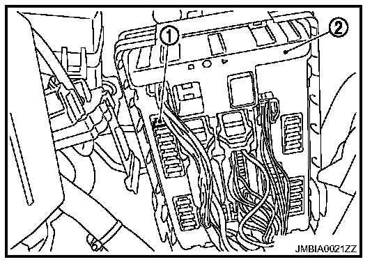 3. Disconnect fuel pump fuse (1) from IPDM E/R (2) to avoid fuel injection during measurement.