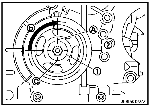 Place a matching mark (A) on crankshaft pulley (2) aligning with the matching mark (C) of crankshaft pulley bolt (1). Tighten the bolt 90° (one marks) (b).