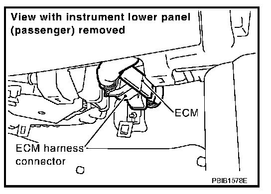 ECM is located behind the passenger side instrument lower panel. For this inspection, remove passenger side instrument lower panel.