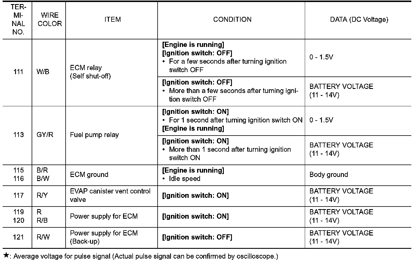 CAUTION: Do not use ECM ground terminals when measuring input/output voltage. Doing so may result in damage to the ECMs transistor. Use a ground other than ECM terminals, such as the ground.