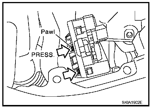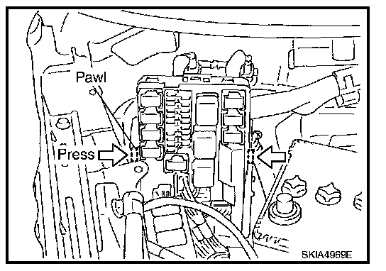 3. While pressing pawls on right and left side of IPDM E/R, remove IPDM E/R cover B from IPDM E/R.