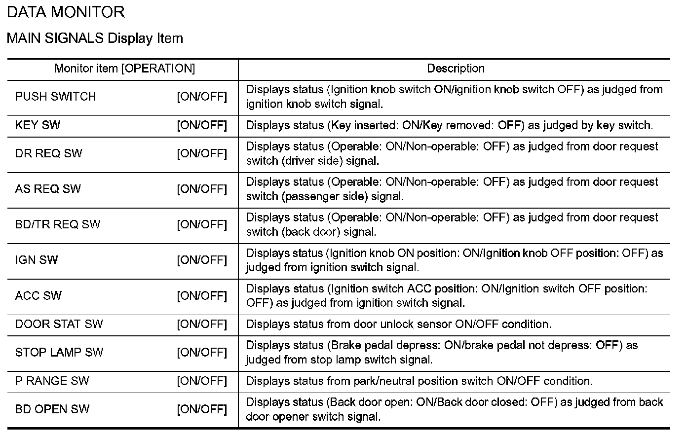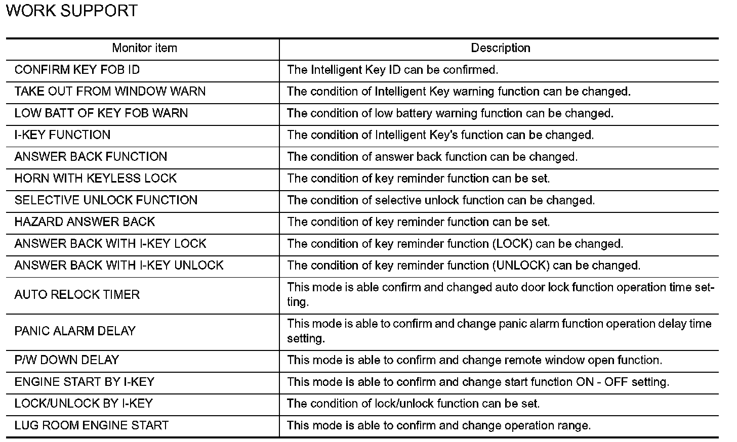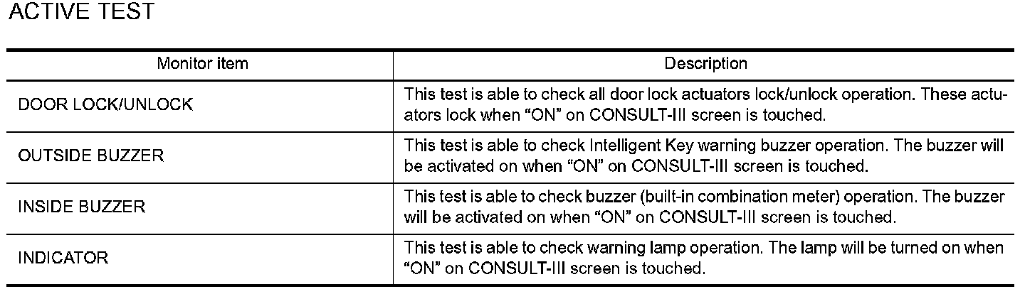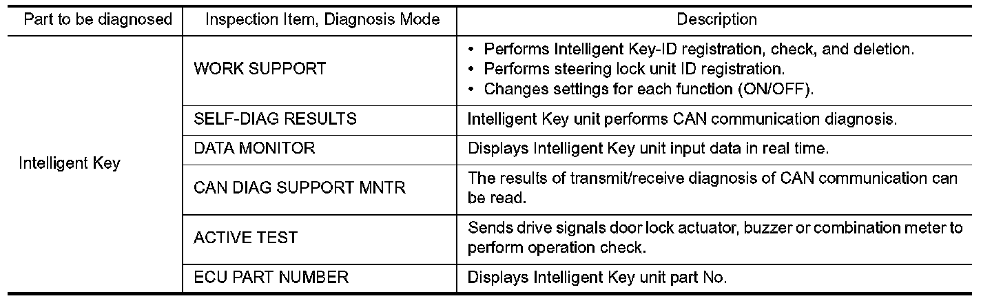 CONSULT-III Functions (INTELLIGENT KEY)- CONSULT-III has display and inspection functions for work support, self-diagnosis, data monitor, and control unit part number by combining data reception and command transmission via communication lines from the Intelligent Key unit.