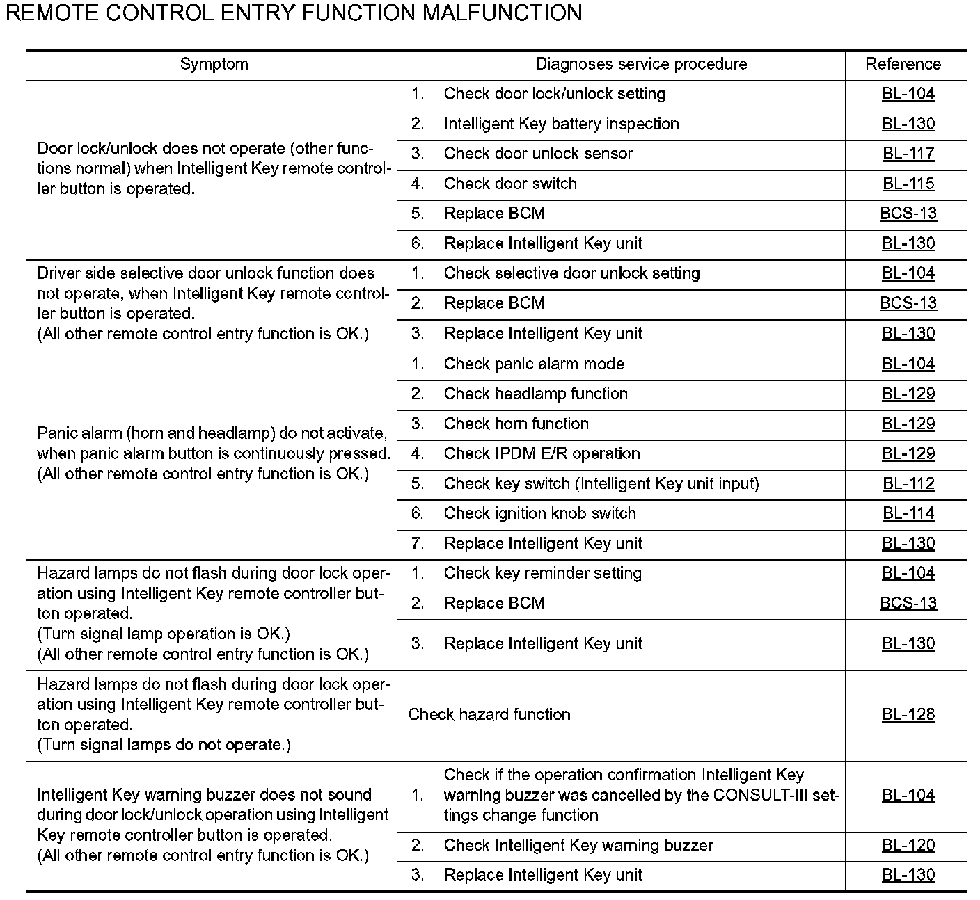 Trouble Diagnosis Symptom Chart - Remote Control Entry Function Malfunction: