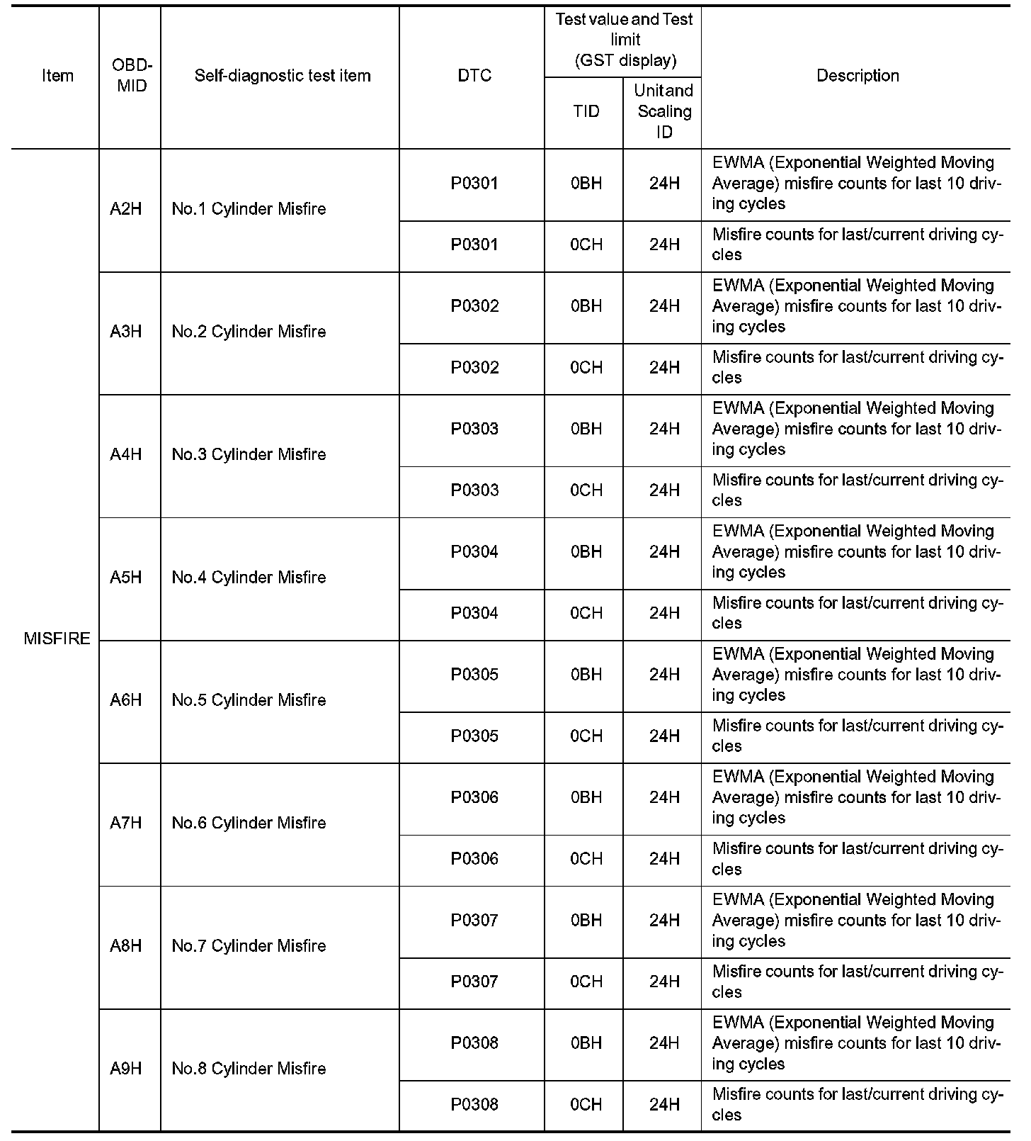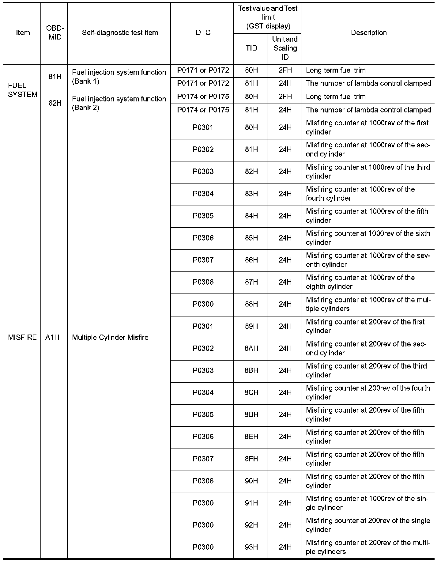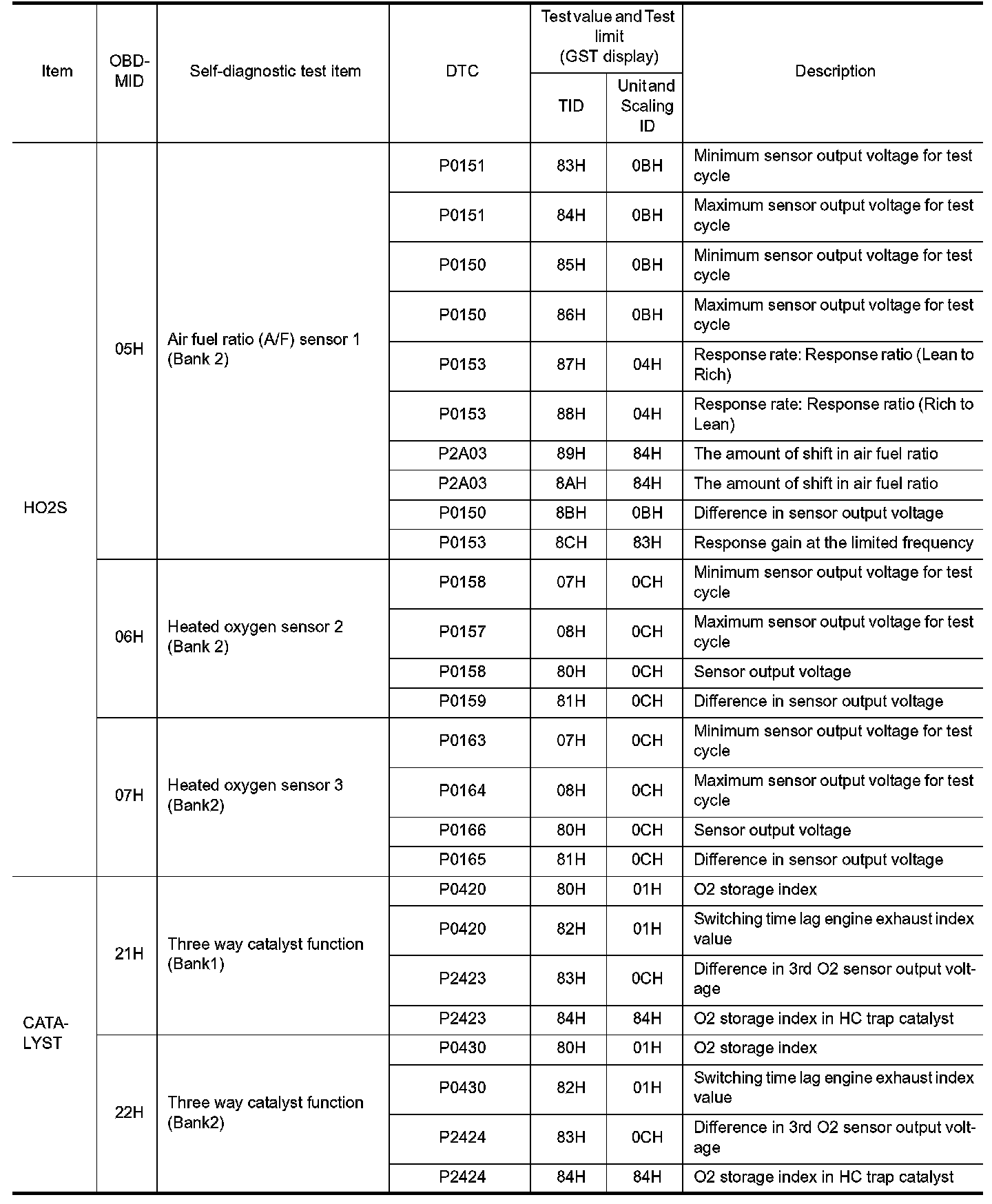 These data (test value and test limit) are specified by On Board Monitor ID(OBDMID), Test ID (TID), Unit and Scaling ID and can be displayed on the GST screen.