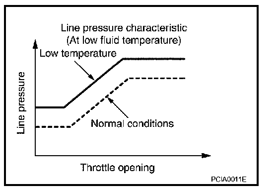 When the A/T fluid temperature drops below the prescribed temperature, in order to speed up the action of each friction element, the line pressure is set higher than the normal line pressure characteristic.