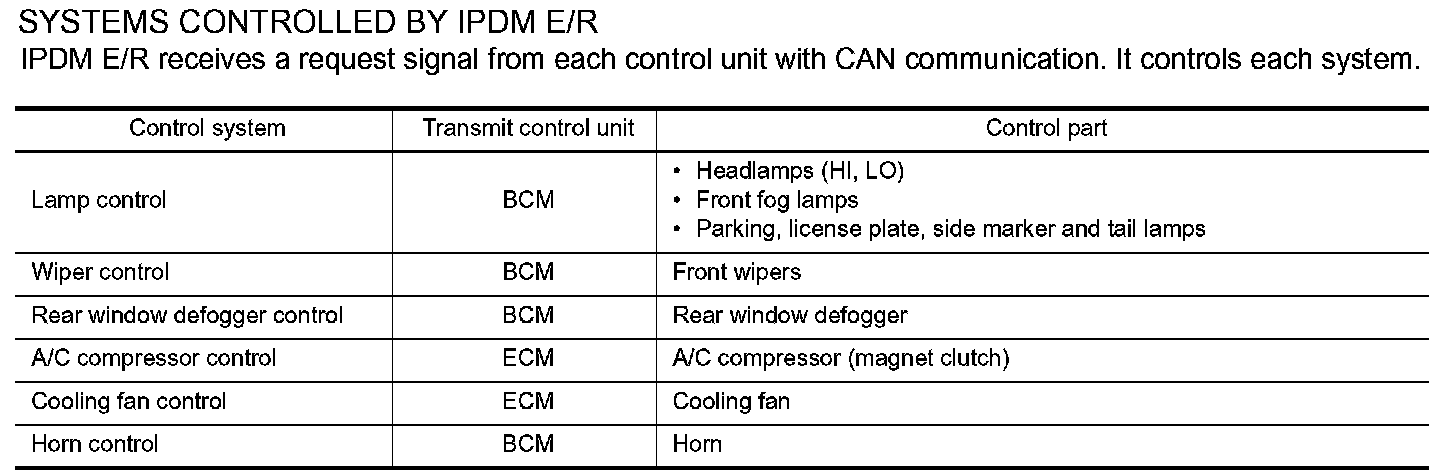 - IPDM E/R (Intelligent Power Distribution Module Engine Room) integrates the relay box and fuse block which were originally placed in engine compartment. It controls integrated relay via IPDM E/R control circuit.