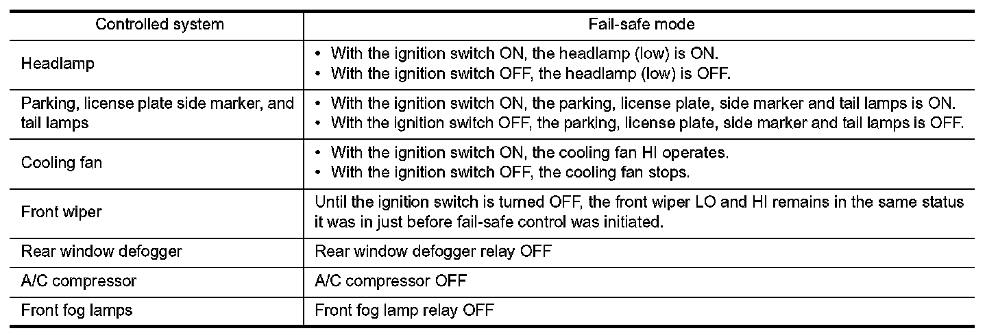 - Operation of control parts by IPDM E/R during fail-safe mode is as follows:
