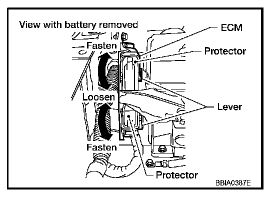 - Before connecting or disconnecting the ECM harness connector, turn ignition switch OFF and disconnect negative battery cable. Failure to do so may damage the ECM because battery voltage is applied to ECM even if ignition switch is turned OFF.