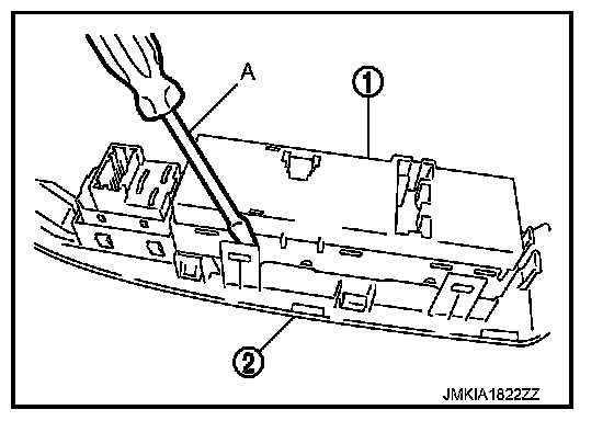 2. Power window main switch (1) is removed from power window main switch finisher (2) using flat-head screw driver (A) etc.