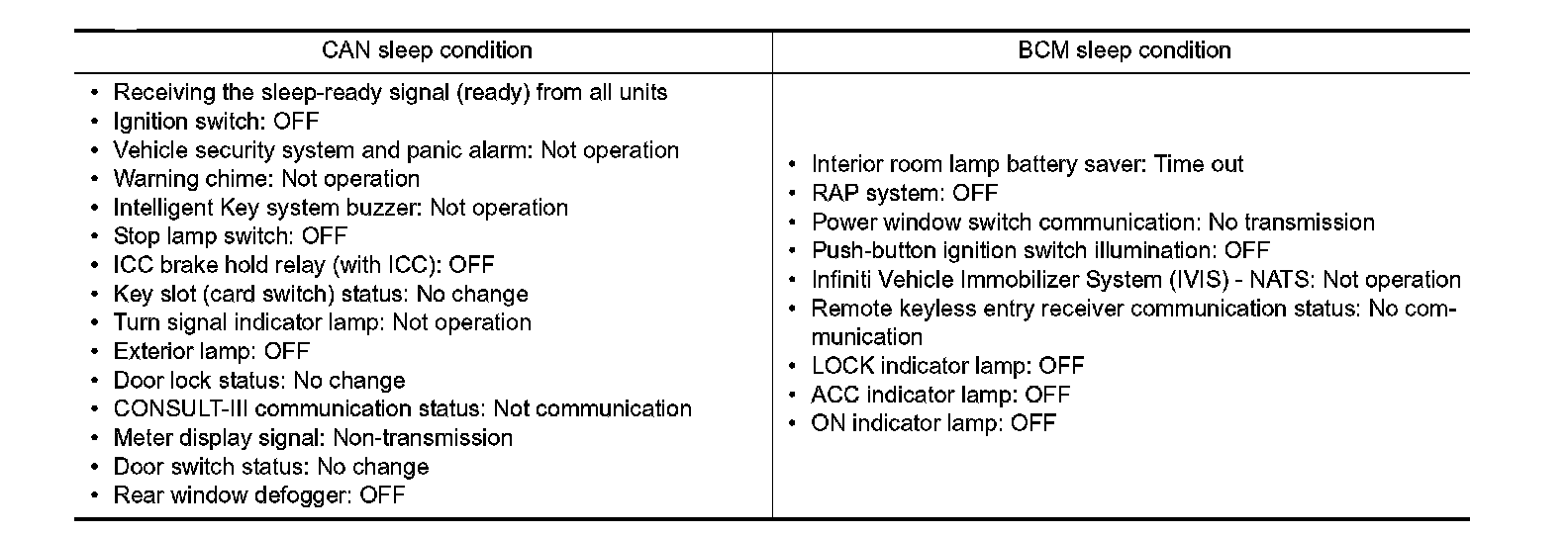 - BCM transmits the sleep wake up signal (sleep) to each unit when all of the CAN sleep conditions are fulfilled.