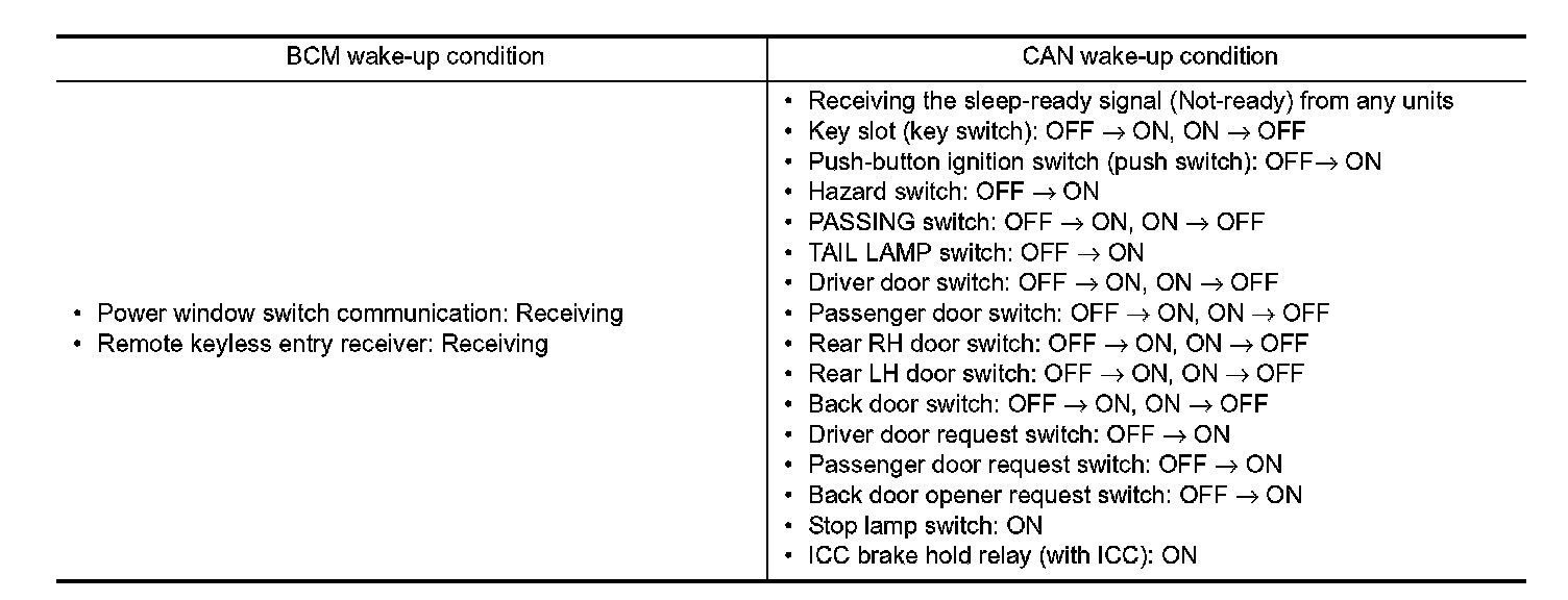 - BCM transmits the sleep wake up signal (wake up) to each unit when any of the CAN wake-up conditions is fulfilled. It changes from the low power consumption mode or the CAN communication sleep mode to the normal mode.