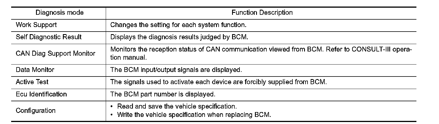 CONSULT-III performs the following functions via CAN communication with BCM.
