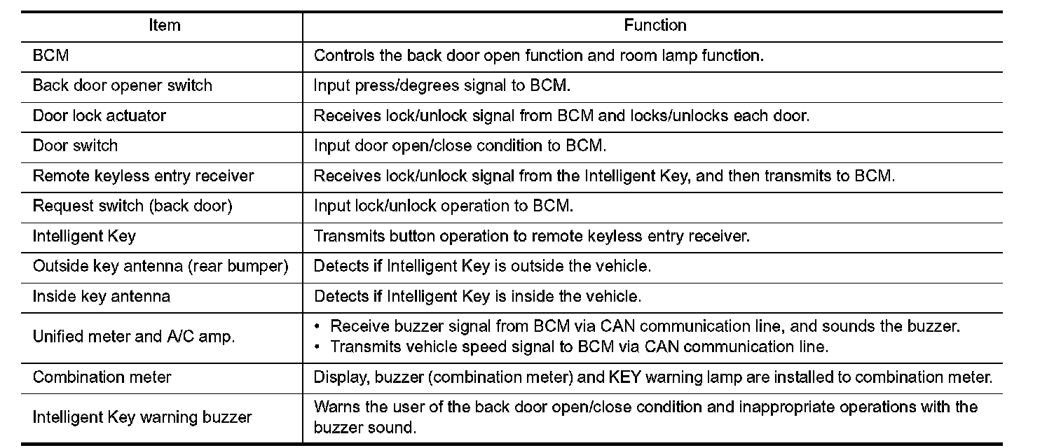 BACK DOOR OPEN FUNCTION : Component Description