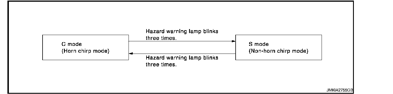 When LOCK and UNLOCK signals are sent from the Intelligent Key for more than 2 seconds at the same time, the hazard and horn reminder mode is changed and hazard warning lamp flashes and horn sounds as per the following: