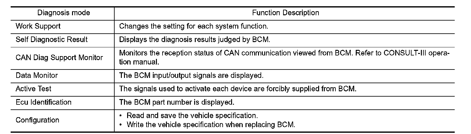 CONSULT-III performs the following functions via CAN communication with BCM.