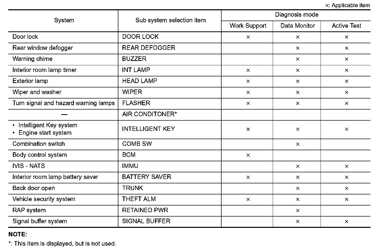 It can perform the diagnosis modes except the following for all sub system selection items.
