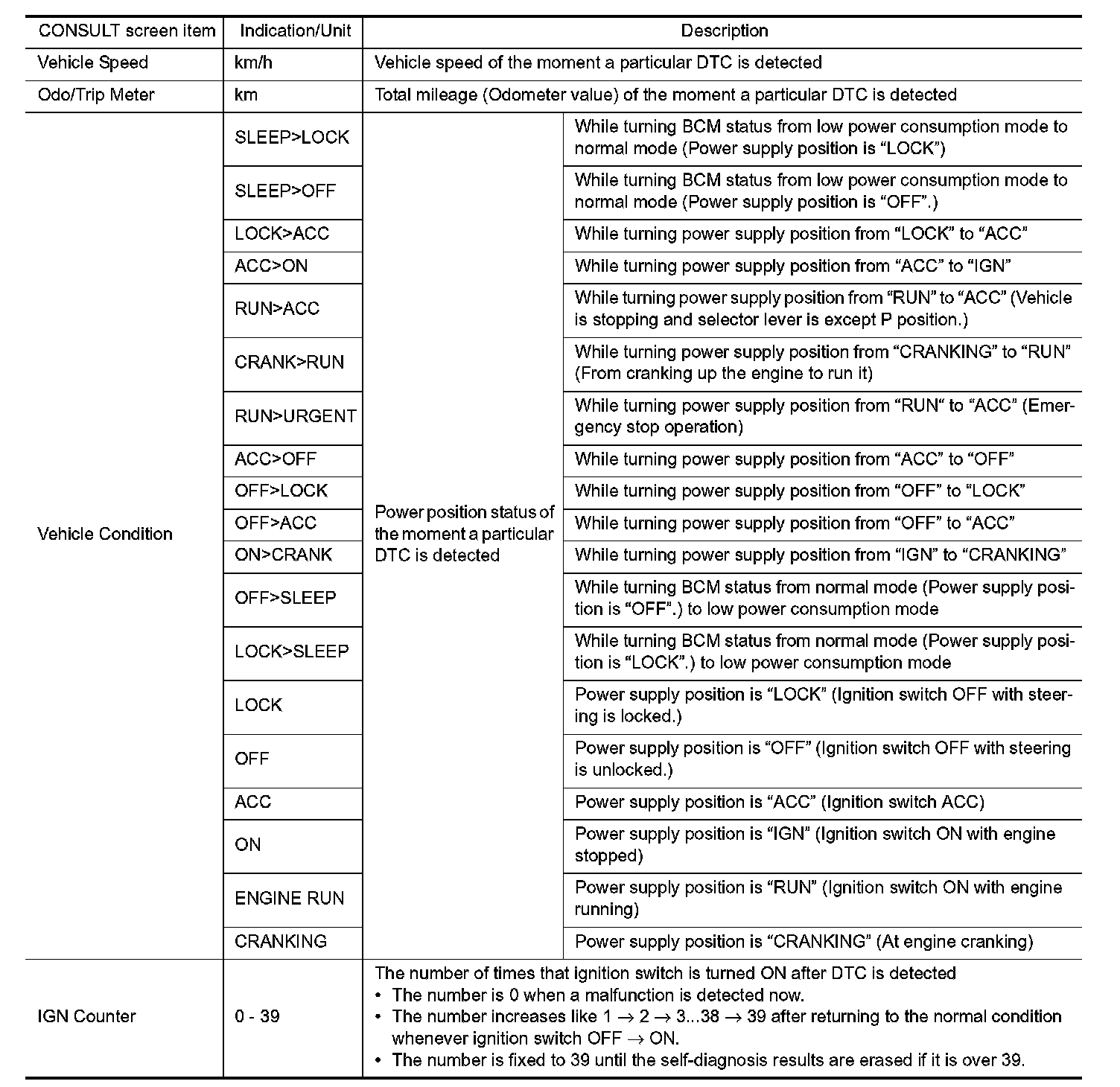 The BCM records the following vehicle condition at the time a particular DTC is detected, and displays on