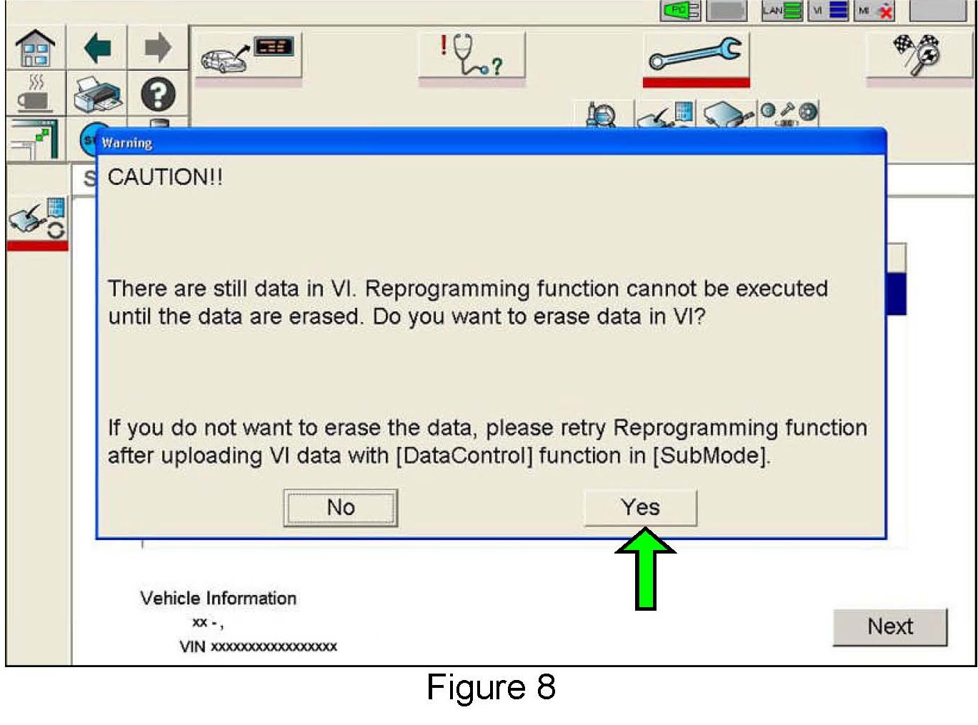 If the screen in Figure 8 appears, there is data stored in the VI. Select "Yes" to proceed with Reprogramming.
