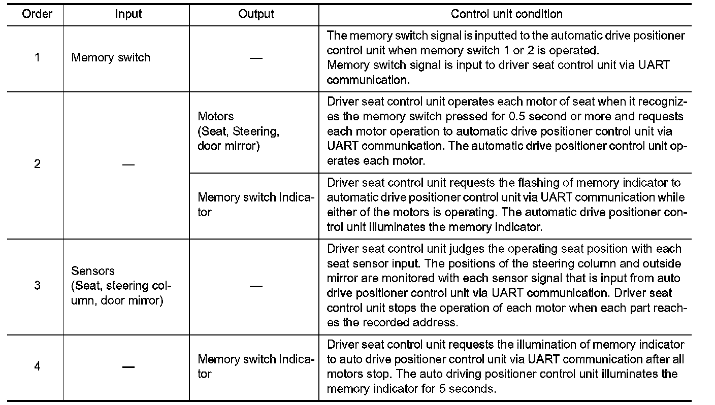 The driver seat control unit can store the optimum driving positions (seat, steering column and door mirror position) for 2 people. If the front seat position is changed, one-touch (pressing desired memory switch for more than 0.5 second) operation allows changing to the other driving position.