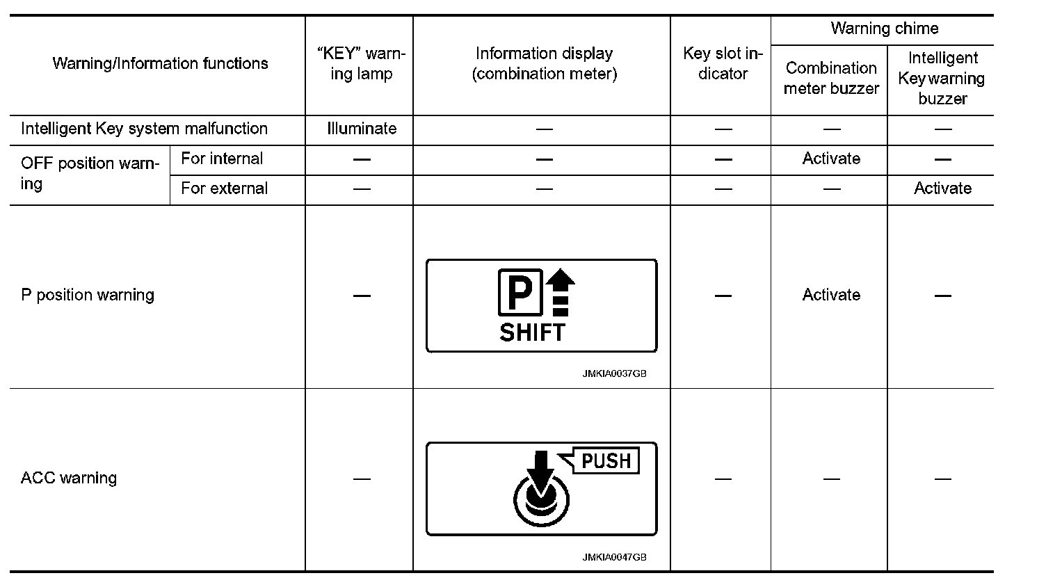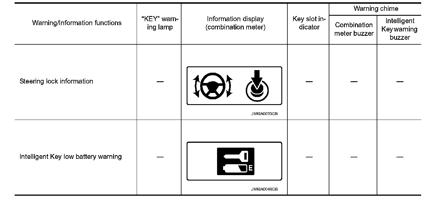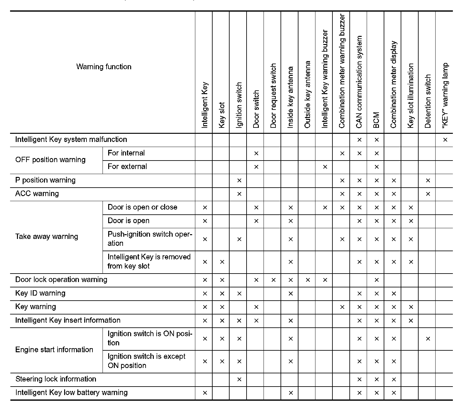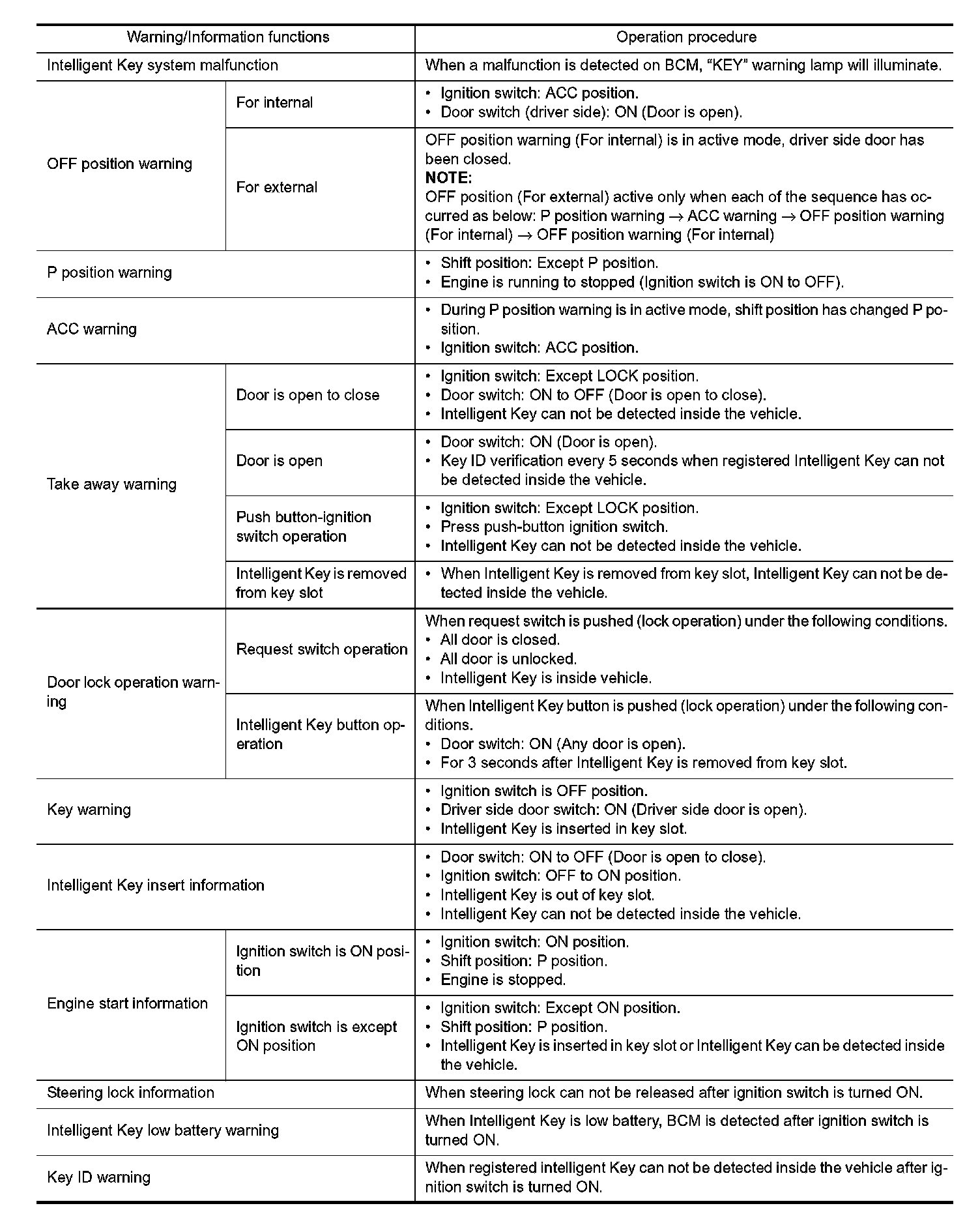 The warning function are as follows and are given to the user as warning information and warnings using combinations of Intelligent Key warning buzzer, KEY warning lamp, key slot illumination and information display in combination meter.