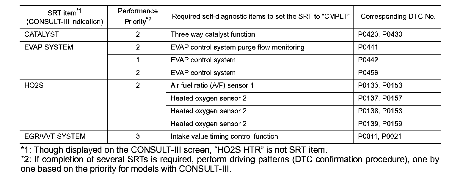 *2: If completion of several SRTs is required, perform driving patterns (DTC confirmation procedure), one by one based on the priority for models with CONSULT-III.