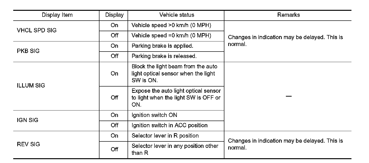 - Displays the status of the following vehicle signals inputted into the AV control unit.