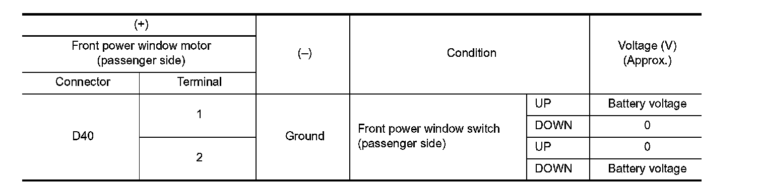 3. Check motor operation by connecting the battery voltage directly to front power window motor (passenger side) terminals.