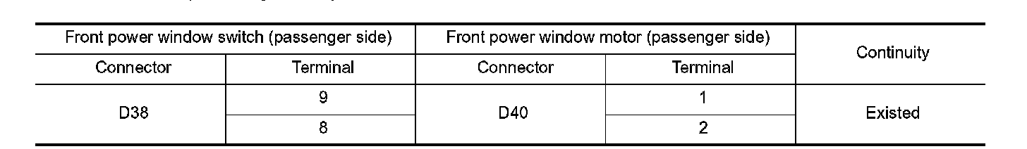 3. Check continuity between front power window switch (passenger side) harness connector and front power window motor (passenger side) harness connector.