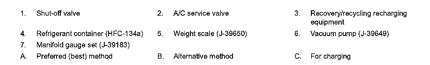 1. Connect recovery/recycling recharging equipment or manifold gauge set (SST: J-39183).