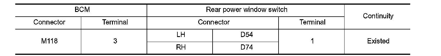 3. Check continuity between BCM harness connector and rear power window switch harness connector.